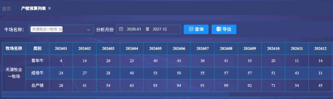 牧业板块数字化升级精准赋能精细养殖。完成丰顿养殖管理系统功能迭代优化,搭建标准化BI数据报表体系,实现奶牛存栏、产奶量、饲喂成本等关键数据可视化分析。创新构建AI智能防疫预警机制,精准推送防疫预警,有效降低疫病传播风险。物联网监测设备试点落地、机车管理系统正式上线,同步优化预算管理流程,单套养殖预算测算时间从48小时压缩至6分钟,管理效率实现质的飞跃。