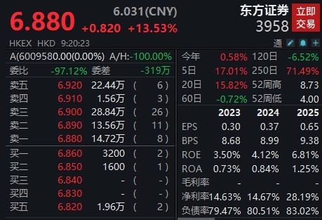 【大河财立方消息】4月20日,港股东方证券(03958.HK)高开13.53%。