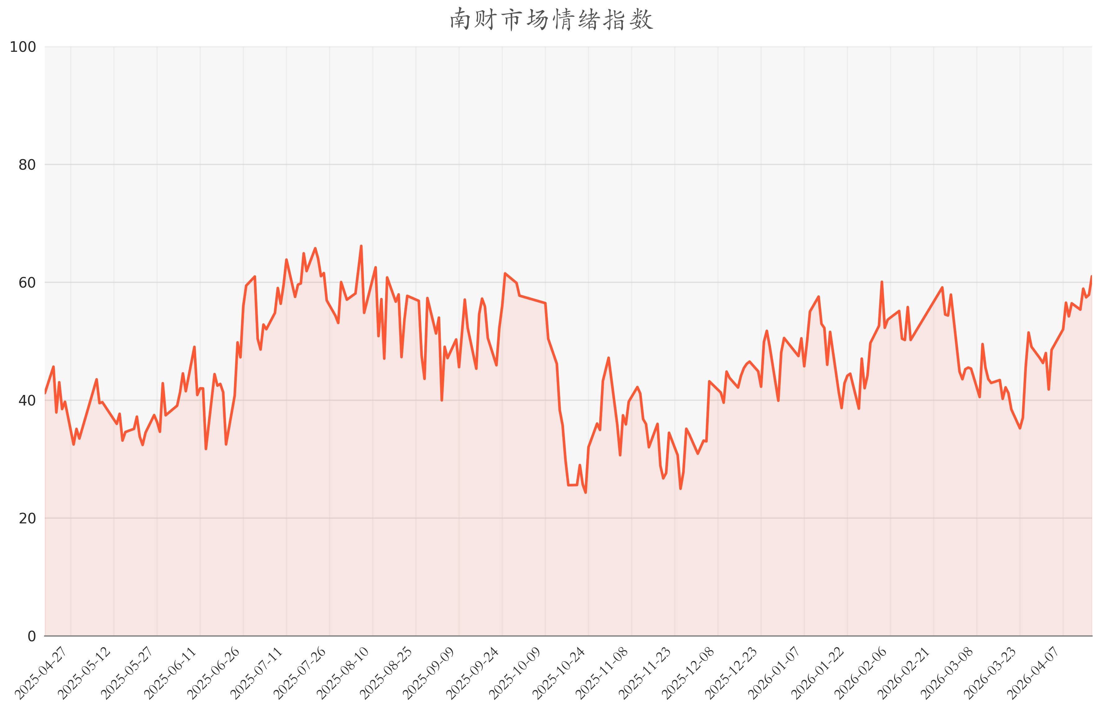南财智讯4月20日电,今日南财市场情绪指数为61.02,较前一交易日57.9有所上涨,市场投资热度提升。从各个细分指标结果上看,ETF净买入额差值与股债回报差处于近一年来中立水平,说明投资者持中立情绪,升贴水率处于近一年来较低水平,说明投资者认为市场趋于触底反弹,两融交易额占比处于近一年来较高水平,说明投资者持看多情绪。除了上述指标之外,50ETF期权隐含波动率波动较低,说明投资者预期市场走势平稳。市场的变化并不由单一的指数或指标所决定,做好资产的均衡配置才能在浮沉的市场中坦然自若。